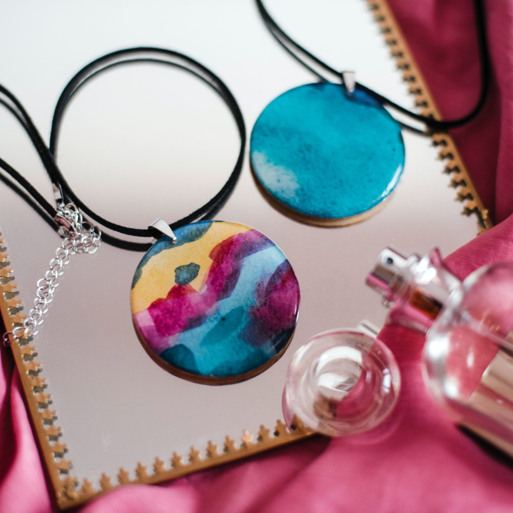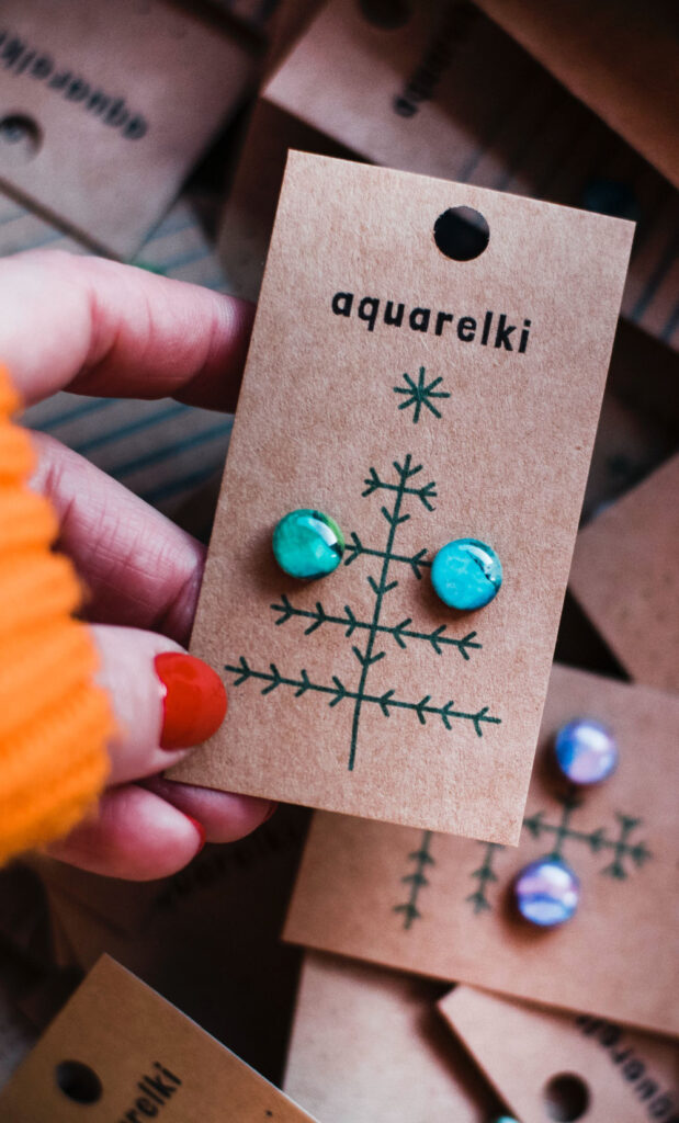 Kolczyki, wisiorki, pinsy i broszki z akwareli nosi się świetnie, są leciutkie, antyalergiczne, mocowane na sztyfcie lub biglu ze stali chirurgicznej. Można iść w nich na raut albo wejść pod prysznic.