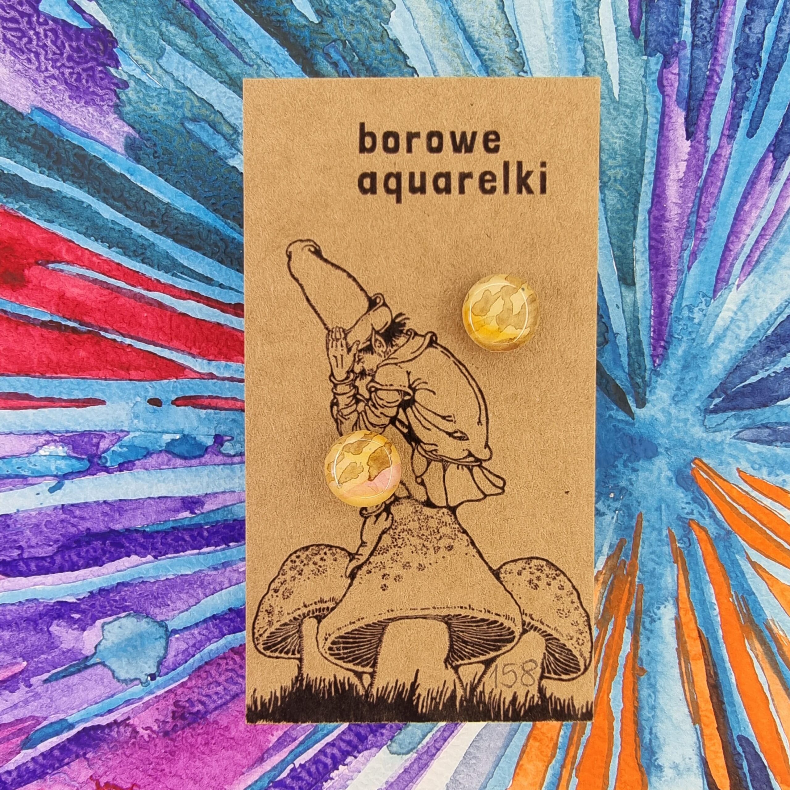 Ręcznie robione kolczyki Aquarelki w kształcie kółek o średnicy 10 mm. Wykonane z oryginalnych prac akwarelowych, utrwalone żywicą epoksydową, na sztyftach ze stali chirurgicznej.