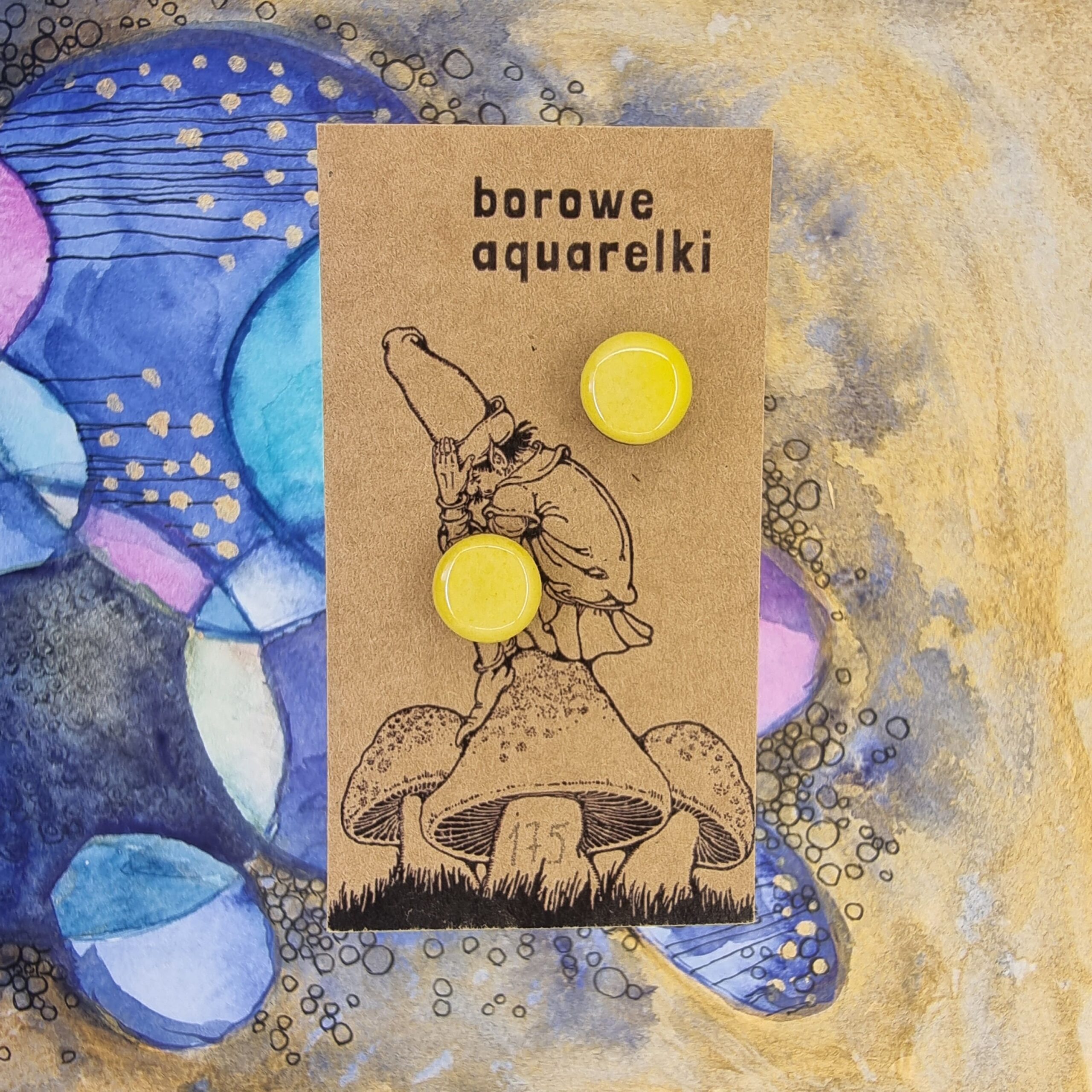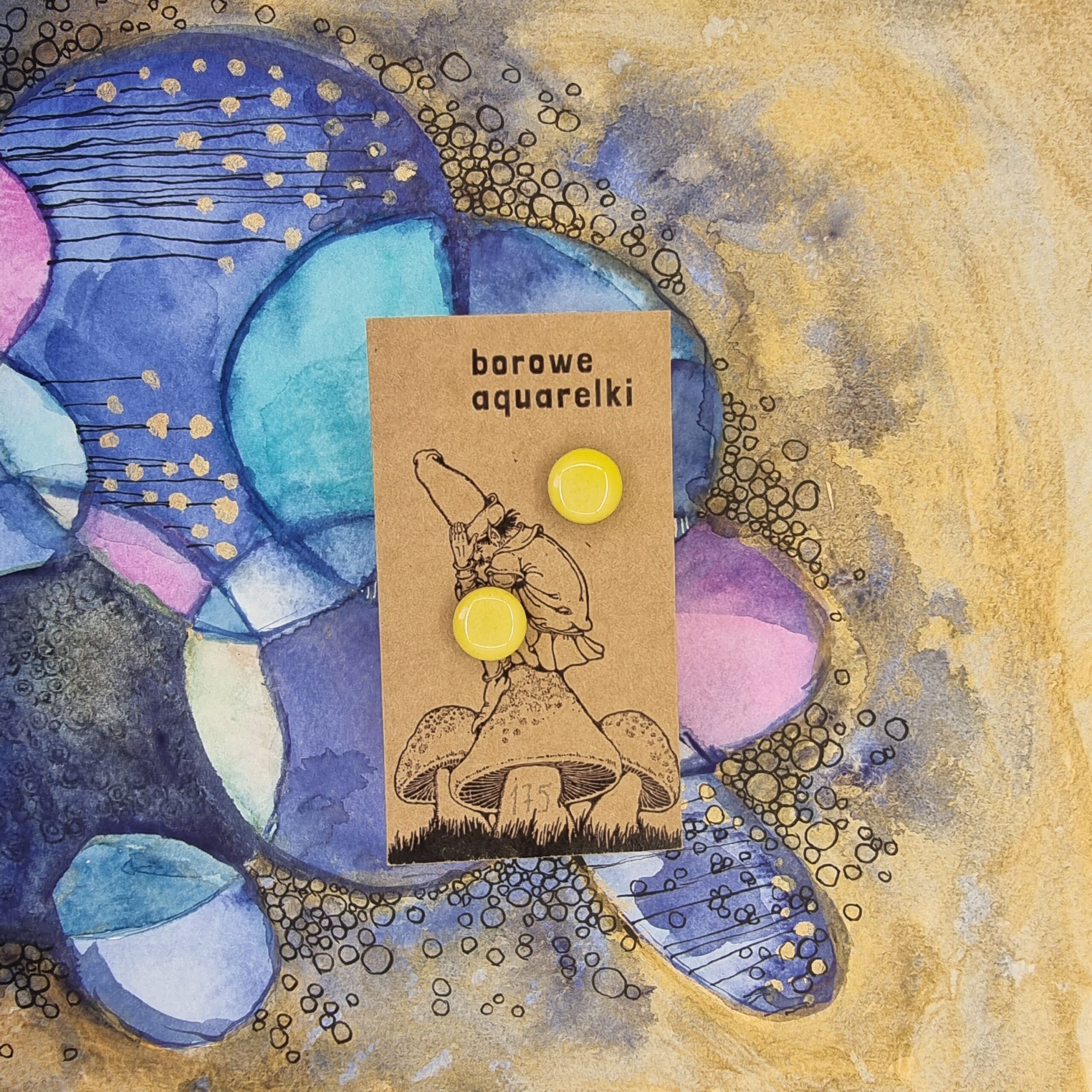 Ręcznie robione kolczyki Aquarelki w kształcie kółek o średnicy 12 mm. Wykonane z oryginalnych prac akwarelowych, utrwalone żywicą epoksydową, na sztyftach ze stali chirurgicznej.