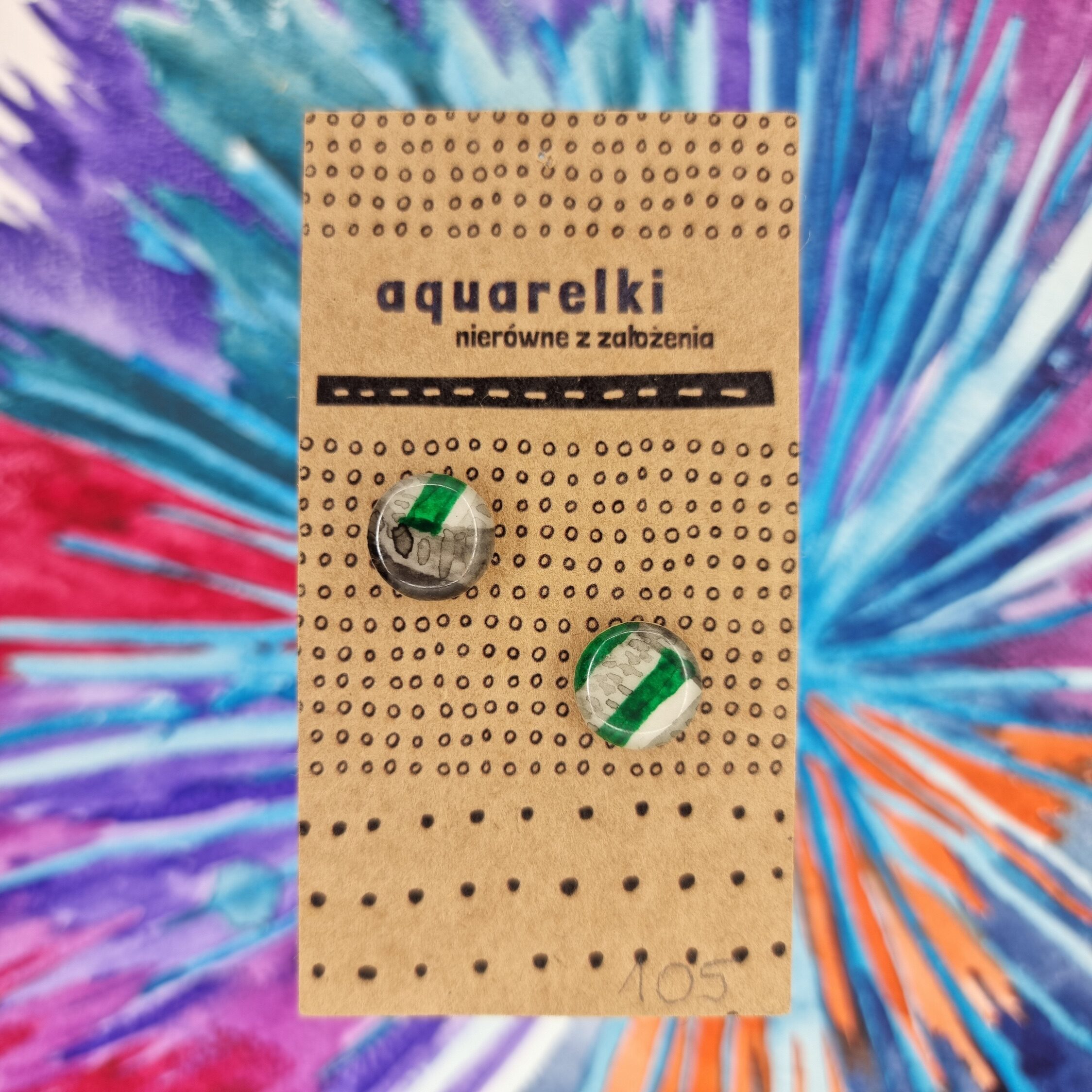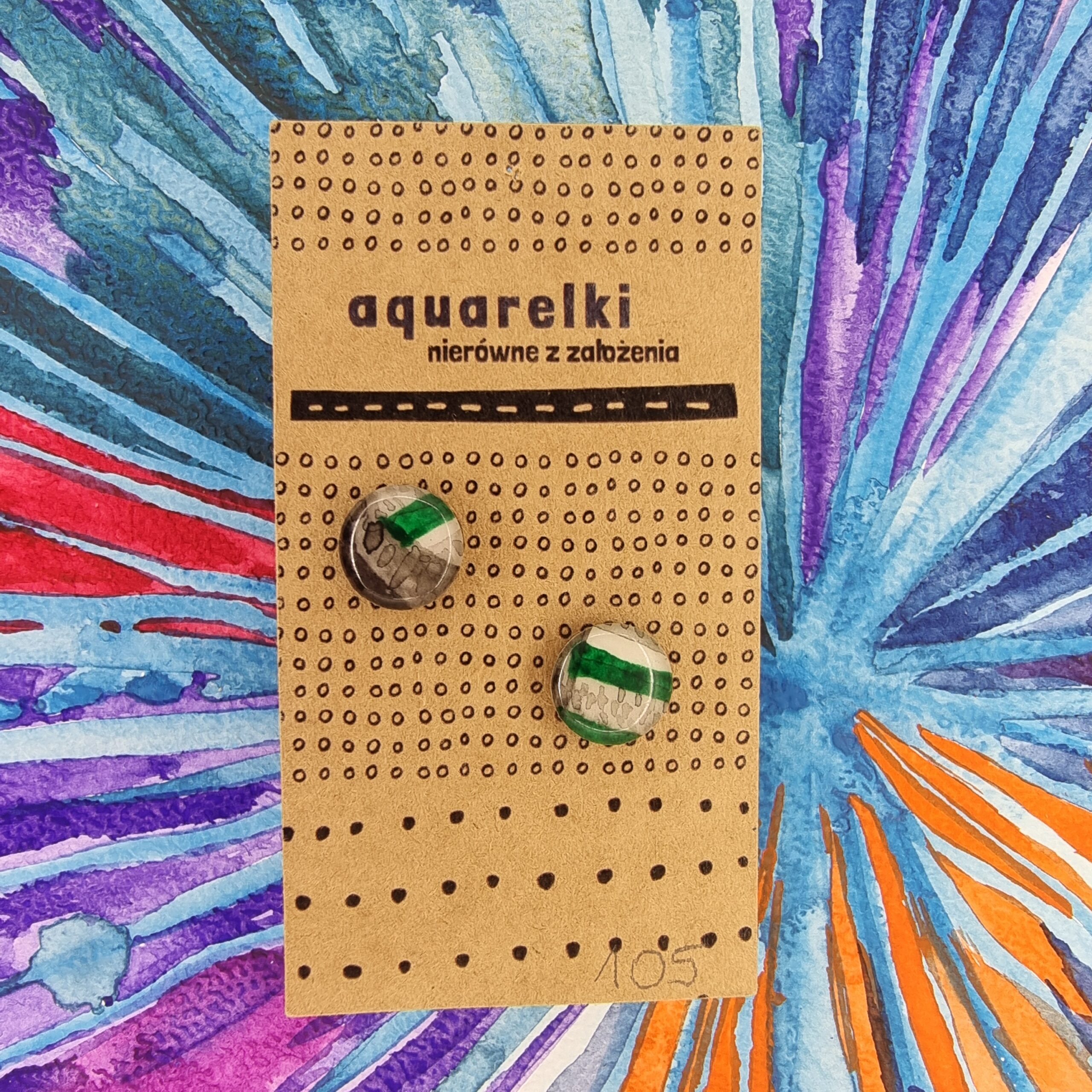 Ręcznie robione kolczyki Aquarelki w kształcie kółek o średnicy 12 mm. Wykonane z oryginalnych prac akwarelowych, utrwalone żywicą epoksydową, na sztyftach ze stali chirurgicznej.