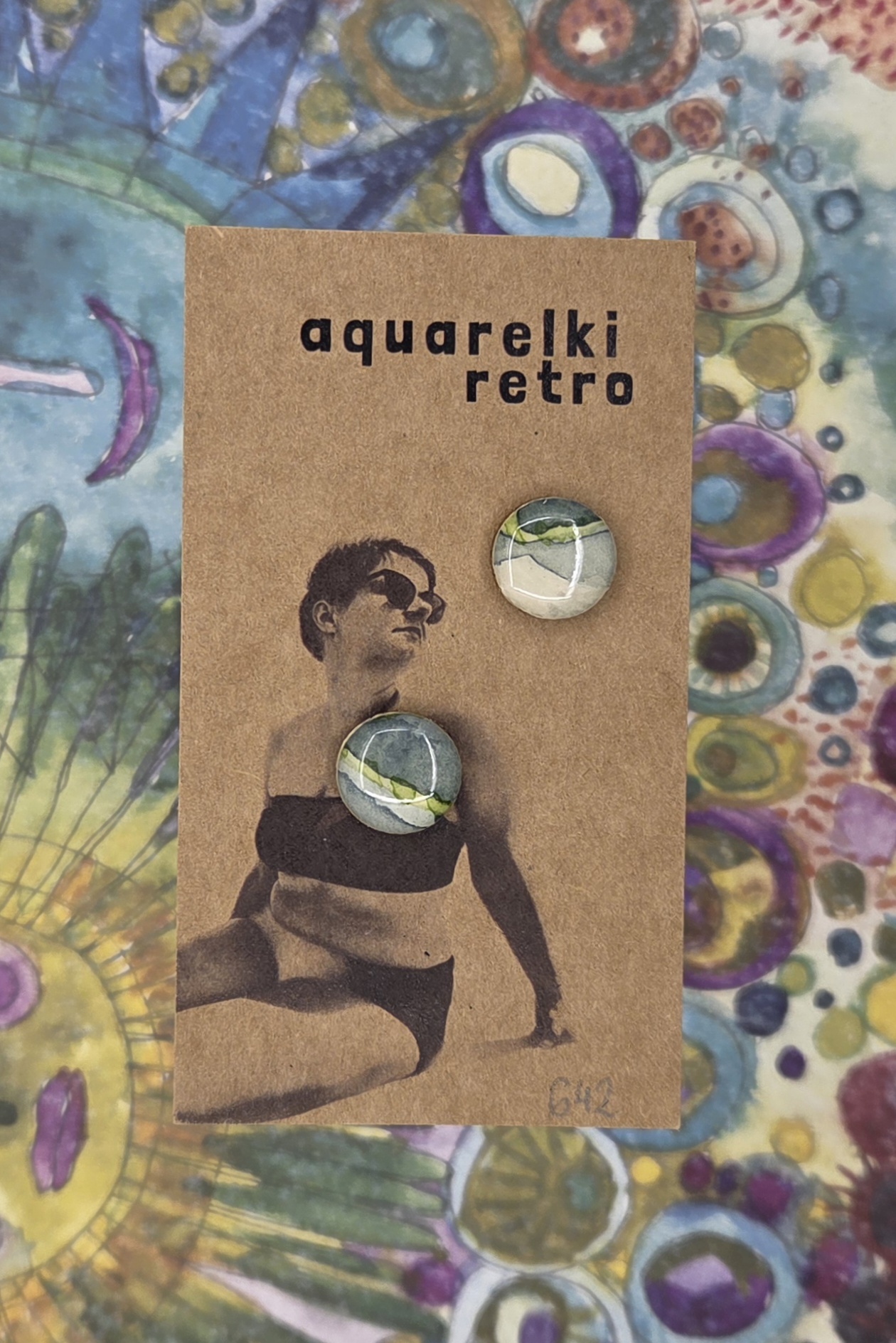 Ręcznie robione kolczyki Aquarelki w kształcie kółek o średnicy 12 mm. Wykonane z oryginalnych prac akwarelowych, utrwalone żywicą epoksydową, na sztyftach ze stali chirurgicznej.