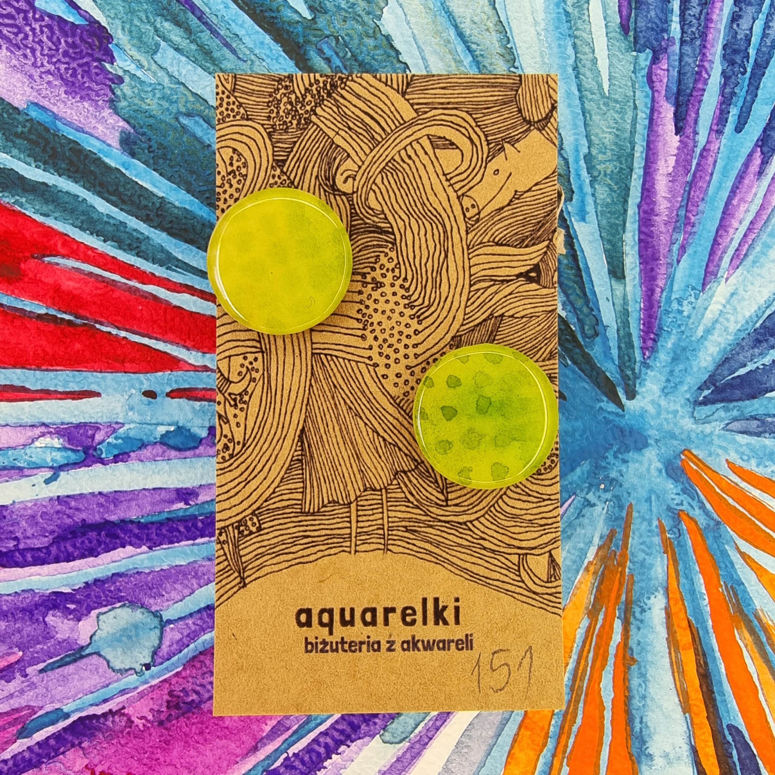 Ręcznie robione kolczyki Aquarelki w kształcie kółek o średnicy 20 mm. Wykonane z oryginalnych prac akwarelowych, utrwalone żywicą epoksydową, na sztyftach ze stali chirurgicznej.