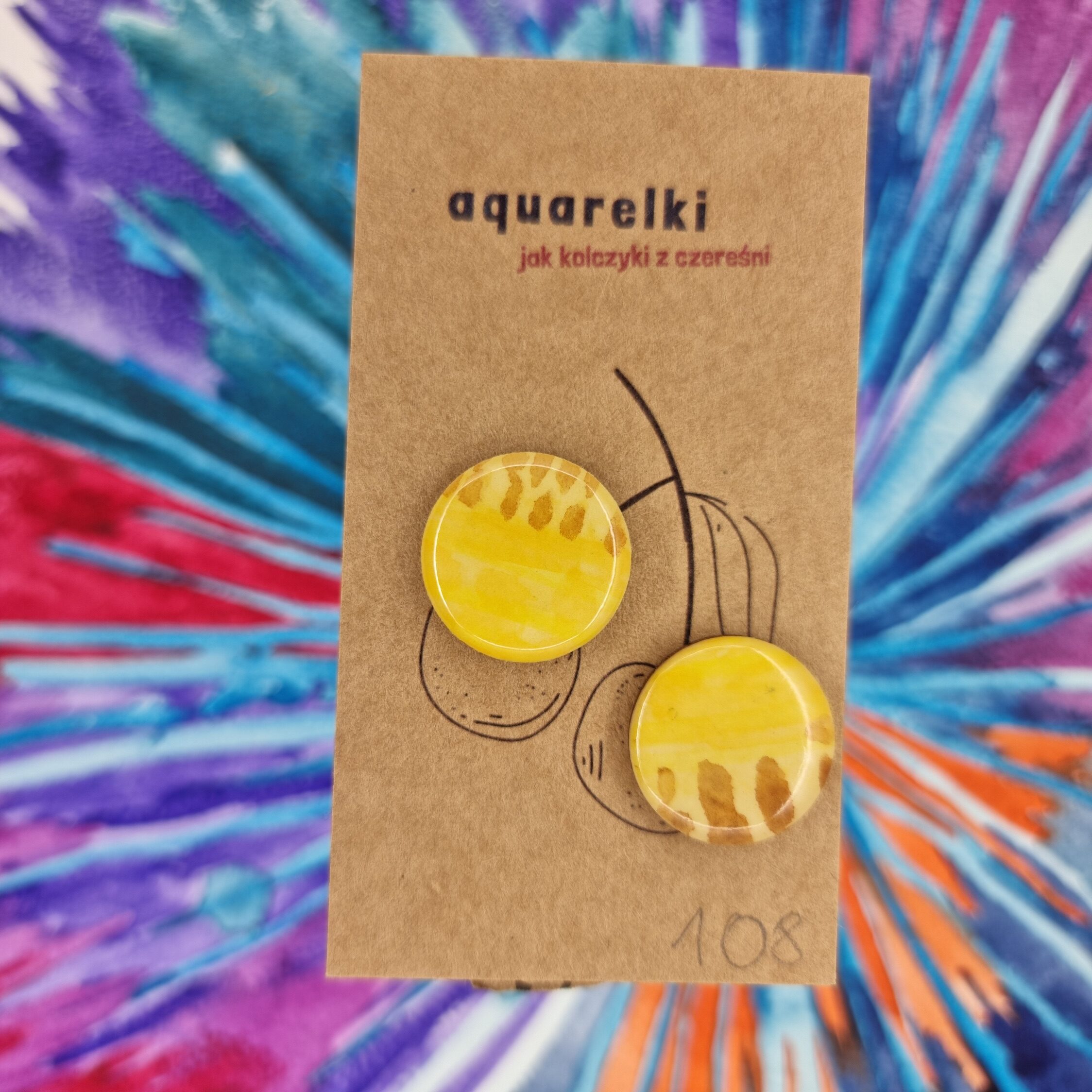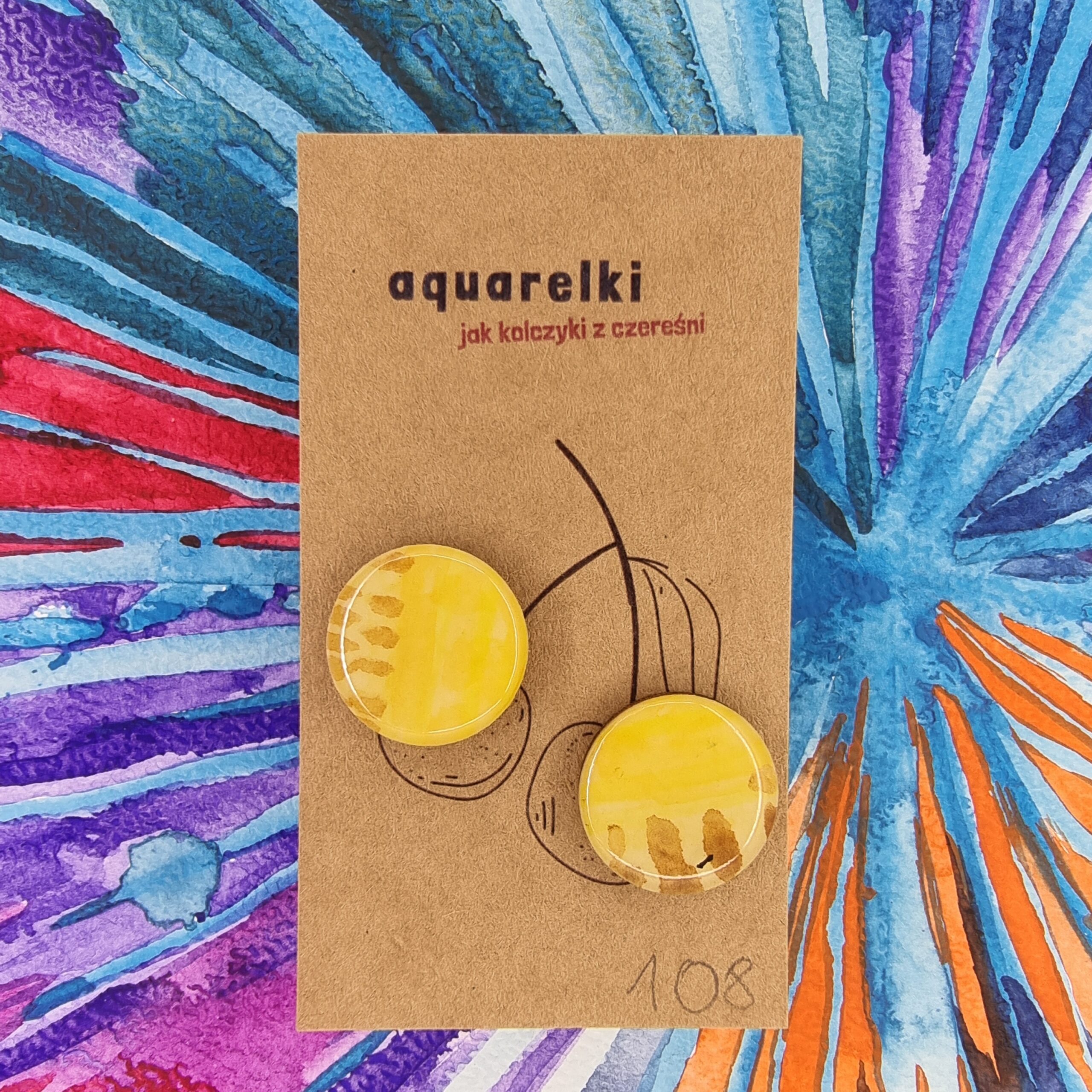 Ręcznie robione kolczyki Aquarelki w kształcie kółek o średnicy 20 mm. Wykonane z oryginalnych prac akwarelowych, utrwalone żywicą epoksydową, na sztyftach ze stali chirurgicznej.