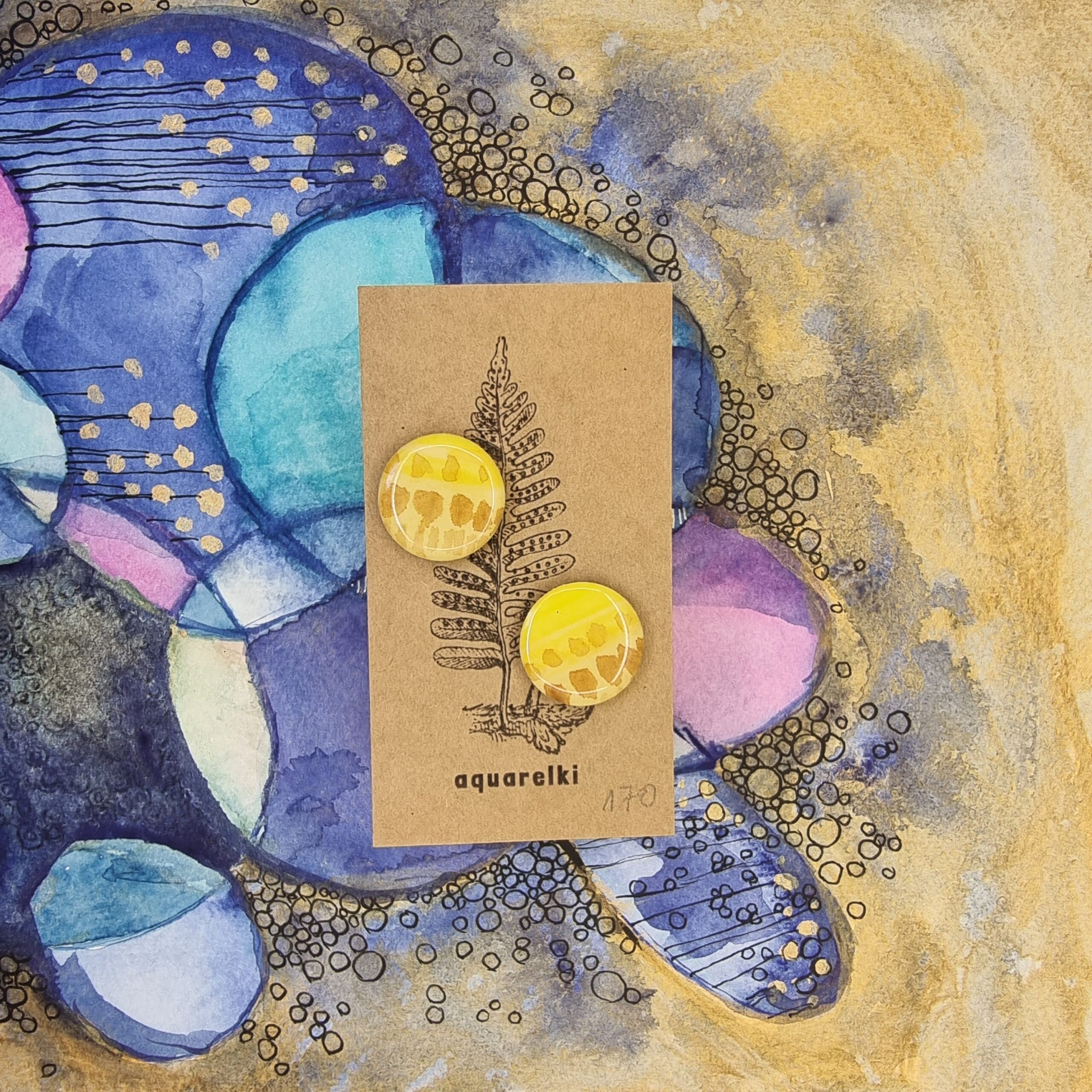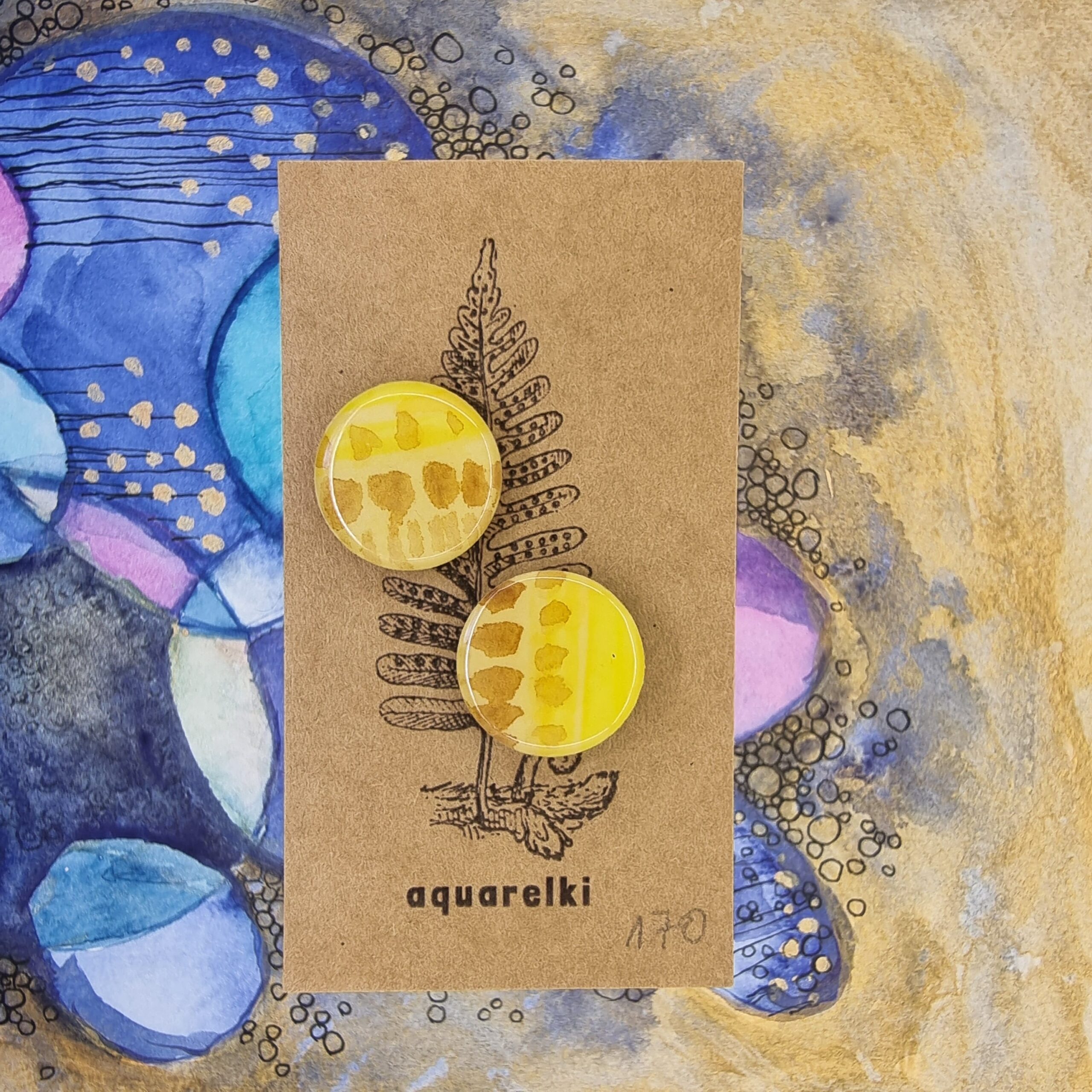Ręcznie robione kolczyki Aquarelki w kształcie kółek o średnicy 20 mm. Wykonane z oryginalnych prac akwarelowych, utrwalone żywicą epoksydową, na sztyftach ze stali chirurgicznej.