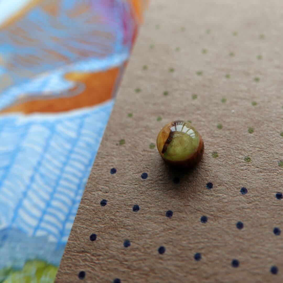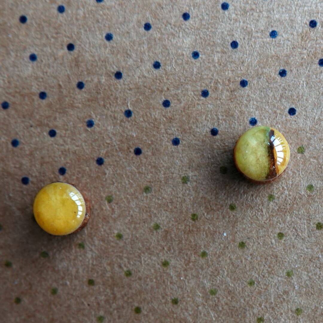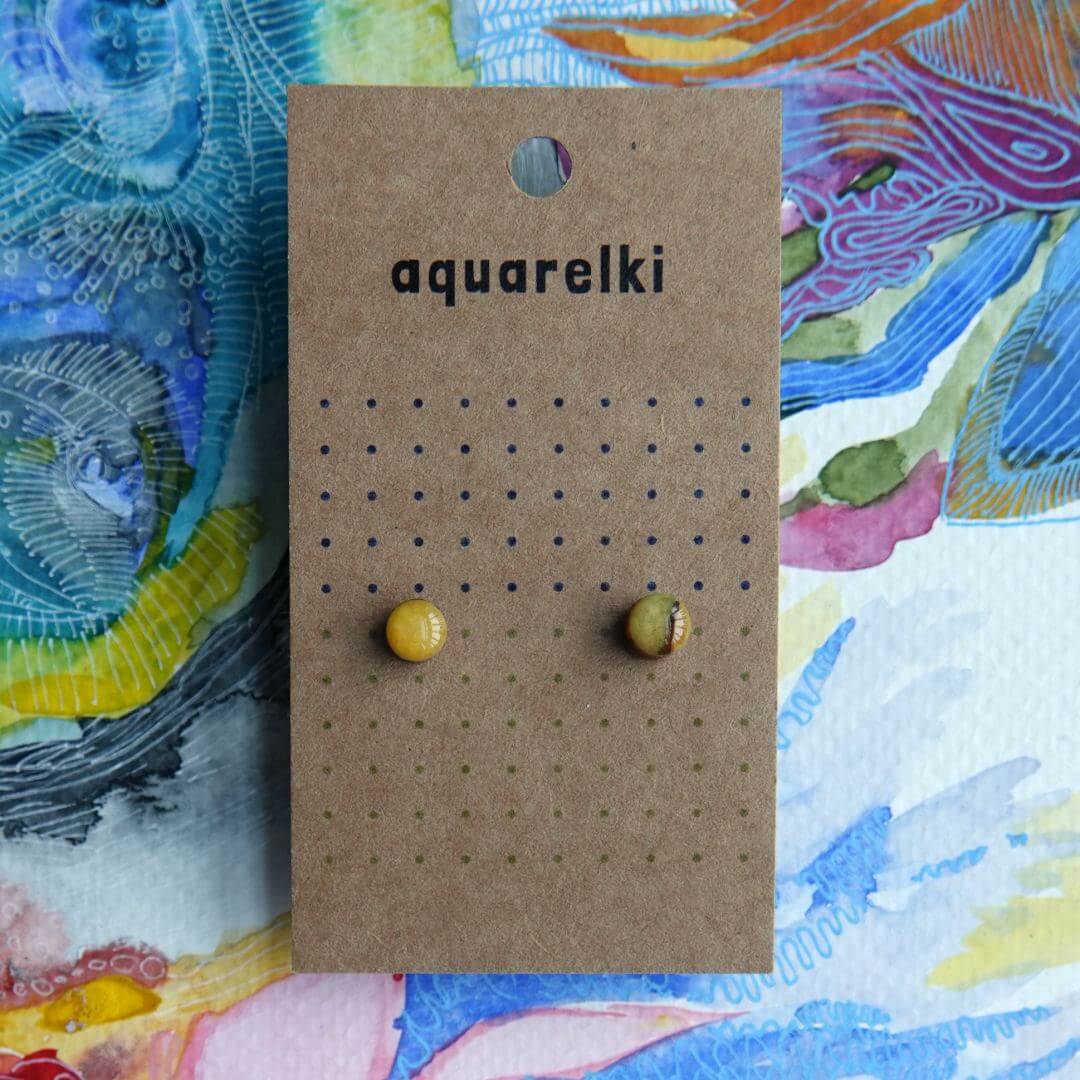 Ręcznie robione kolczyki Aquarelki w kształcie kółek o średnicy 6 mm. Wykonane z oryginalnych prac akwarelowych, utrwalone żywicą epoksydową, na sztyftach ze stali chirurgicznej.