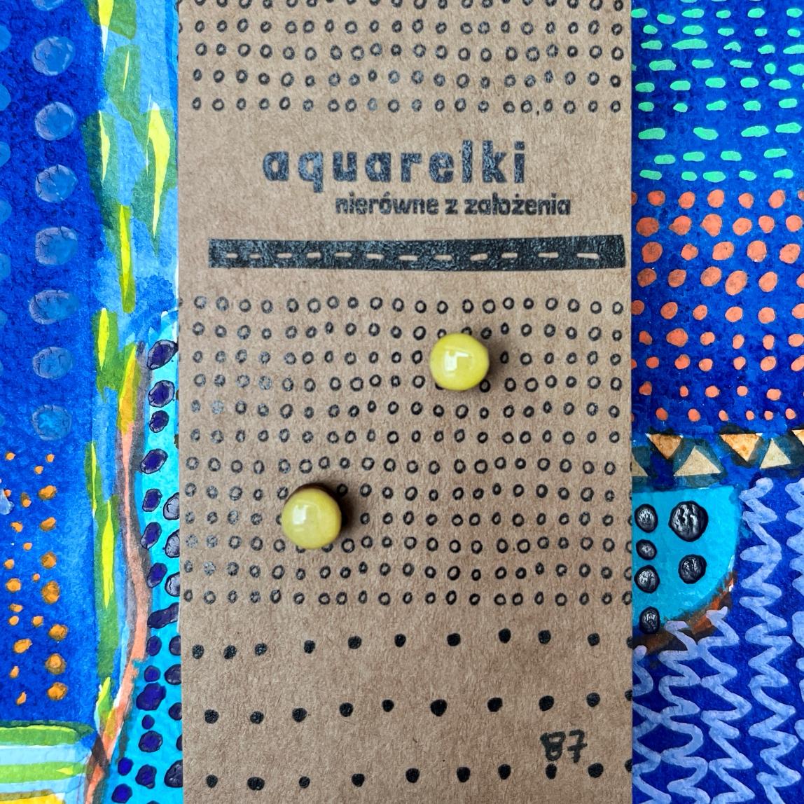Ręcznie robione kolczyki Aquarelki w kształcie kółek o średnicy 6 mm. Wykonane z oryginalnych prac akwarelowych, utrwalone żywicą epoksydową, na sztyftach ze stali chirurgicznej.