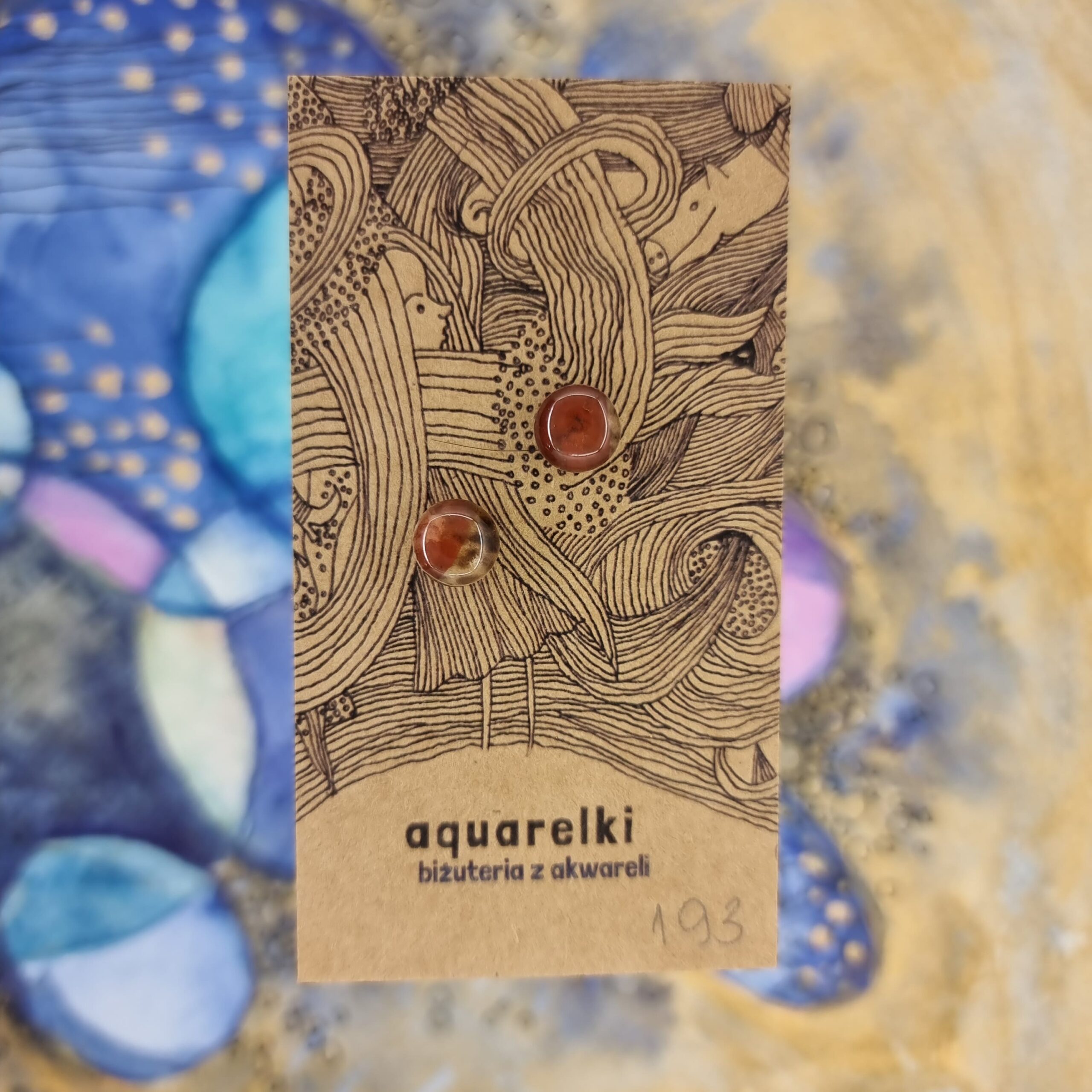 Ręcznie robione kolczyki Aquarelki w kształcie kółek o średnicy 8 mm. Wykonane z oryginalnych prac akwarelowych, utrwalone żywicą epoksydową, na sztyftach ze stali chirurgicznej.