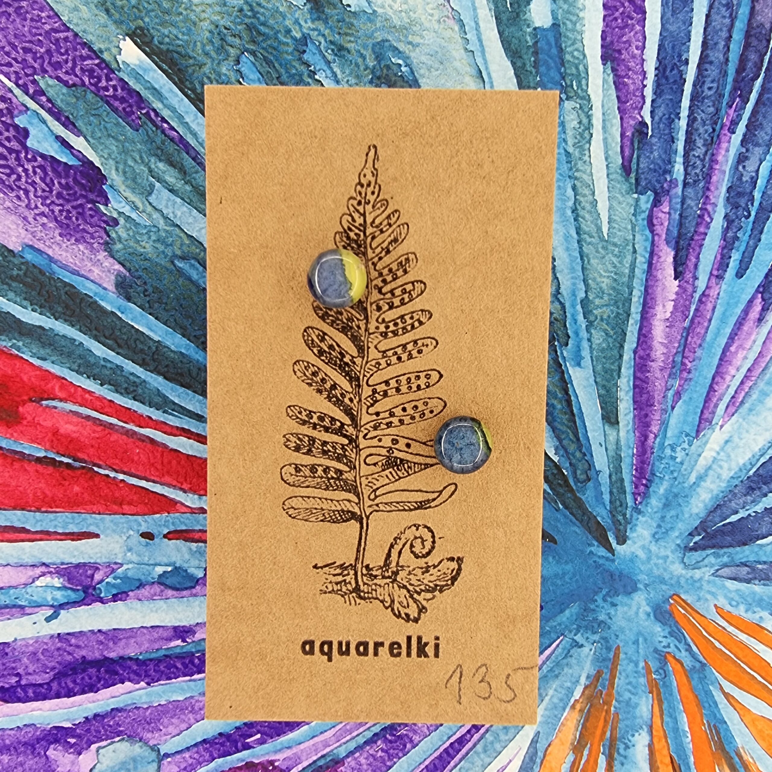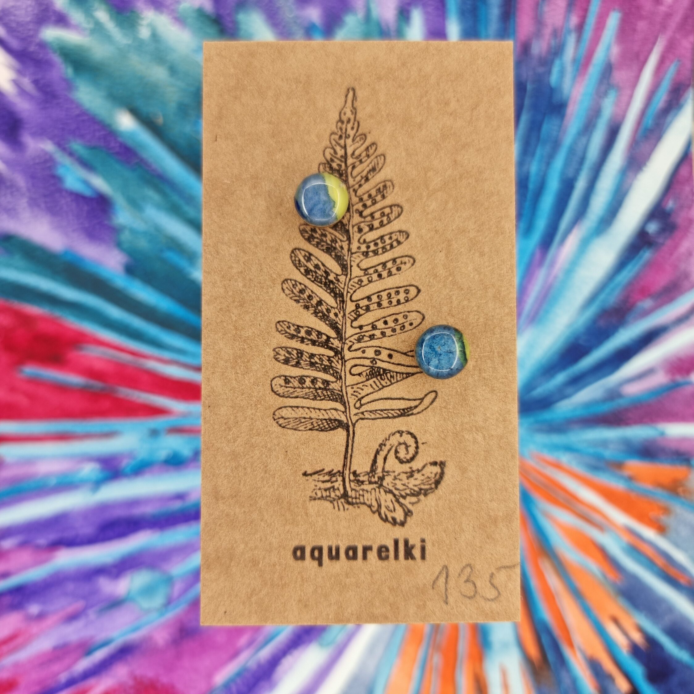 Ręcznie robione kolczyki Aquarelki w kształcie kółek o średnicy 8 mm. Wykonane z oryginalnych prac akwarelowych, utrwalone żywicą epoksydową, na sztyftach ze stali chirurgicznej.