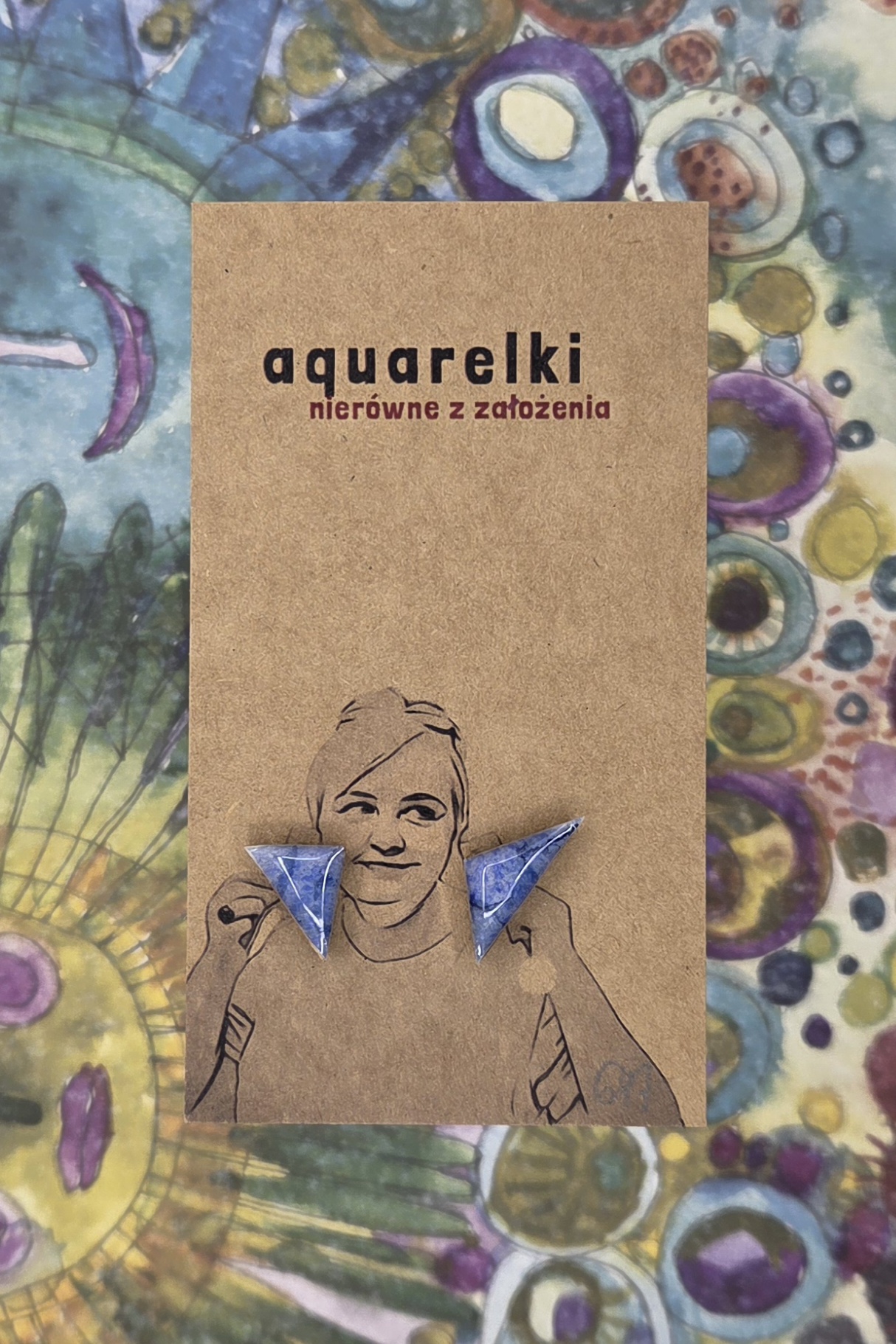Ręcznie robione kolczyki Aquarelki w kształcie trójkatów. Wykonane z oryginalnych prac akwarelowych, utrwalone żywicą epoksydową, na sztyftach ze stali chirurgicznej.