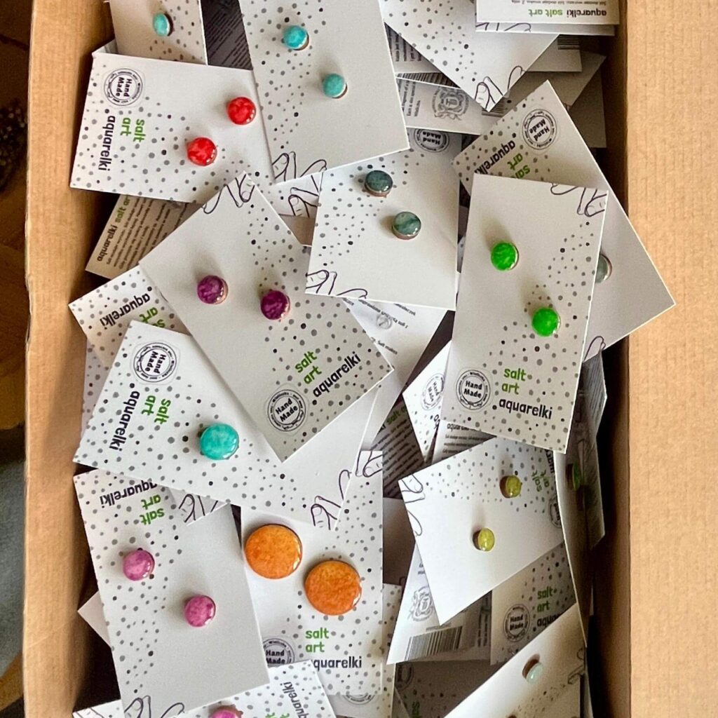 Takie właśnie są Aquarelki SaltArt — stworzone z naturalnego połączenia soli i sztuki. Każdy etap wykonuję ręcznie: od malowania i tworzenia solnych wzorów, przez precyzyjne wycinanie oraz zabezpieczanie kroplą żywicy, aż po staranne komponowanie par.